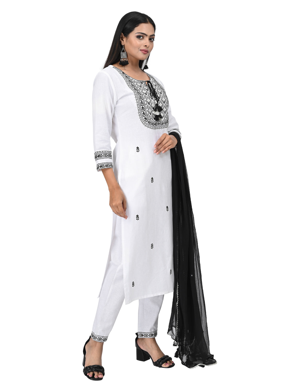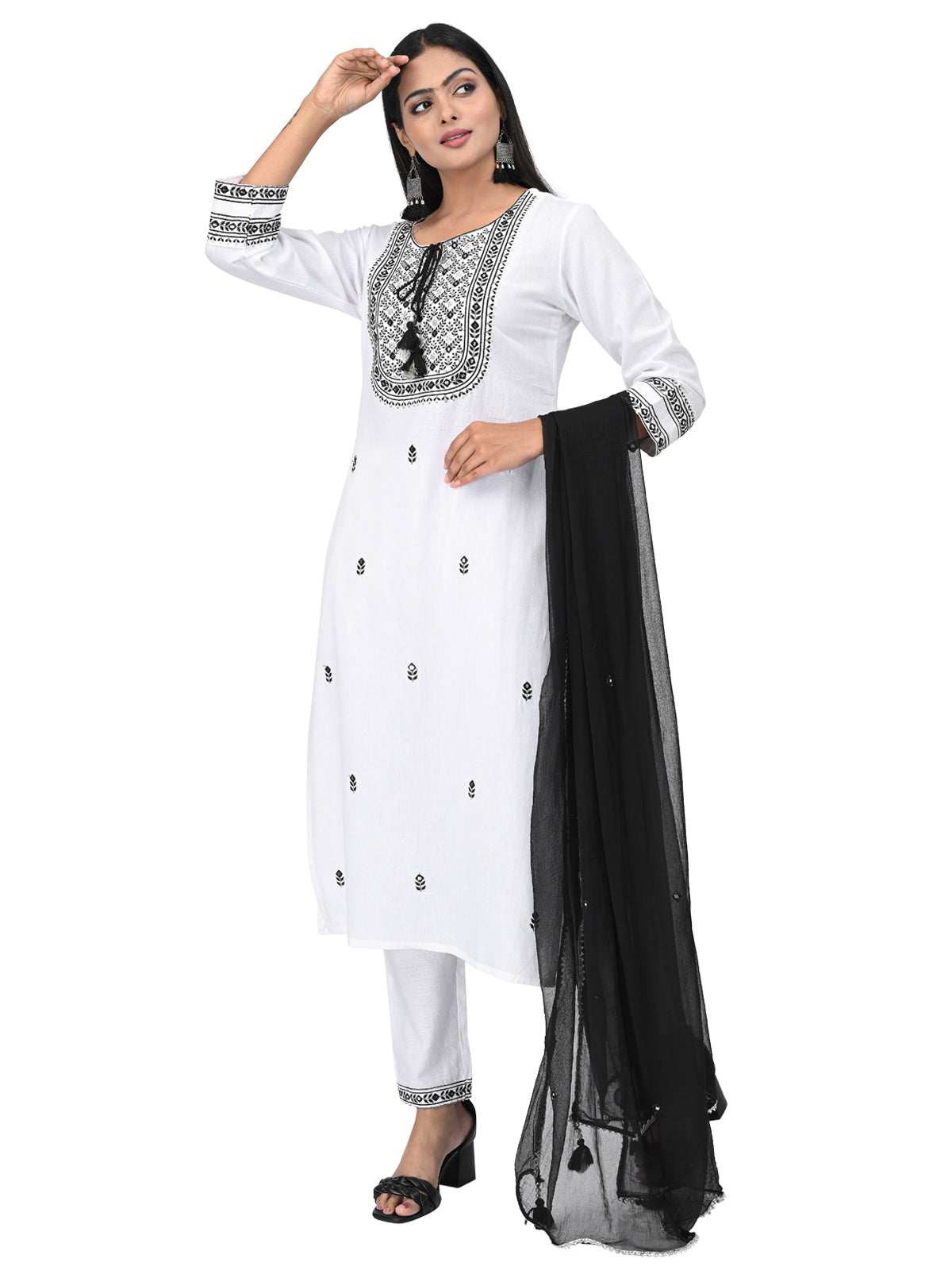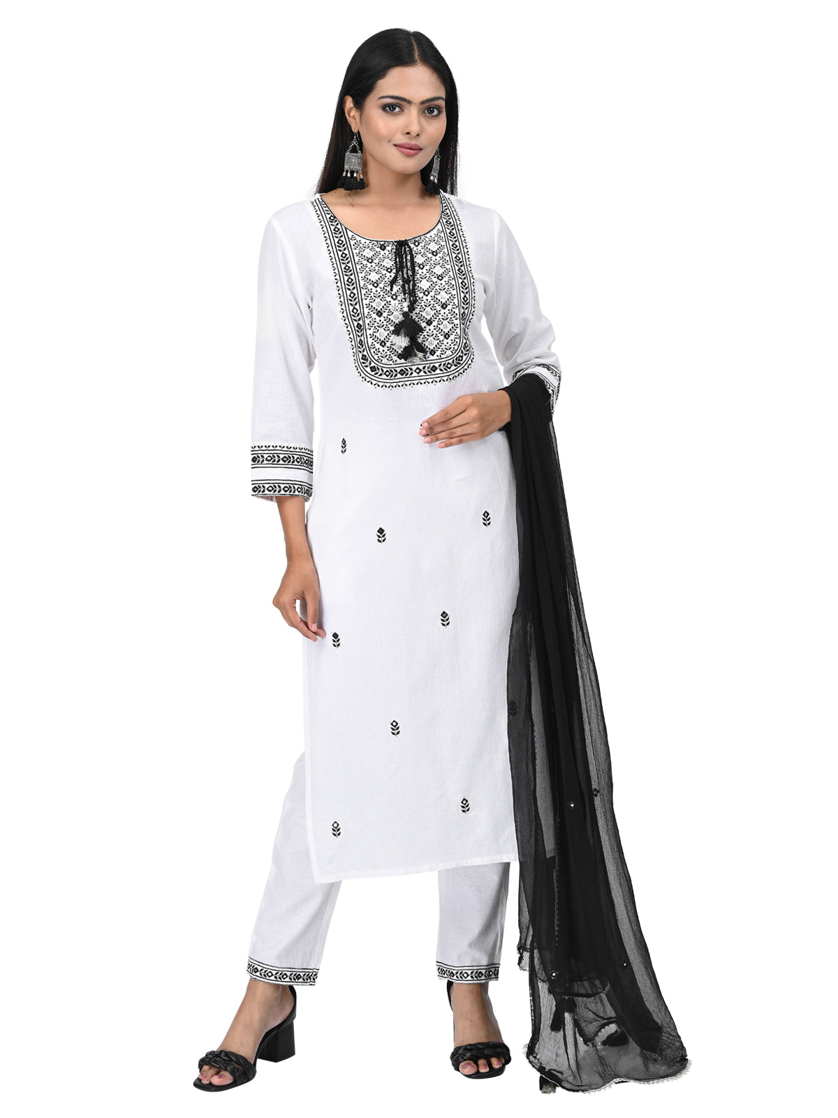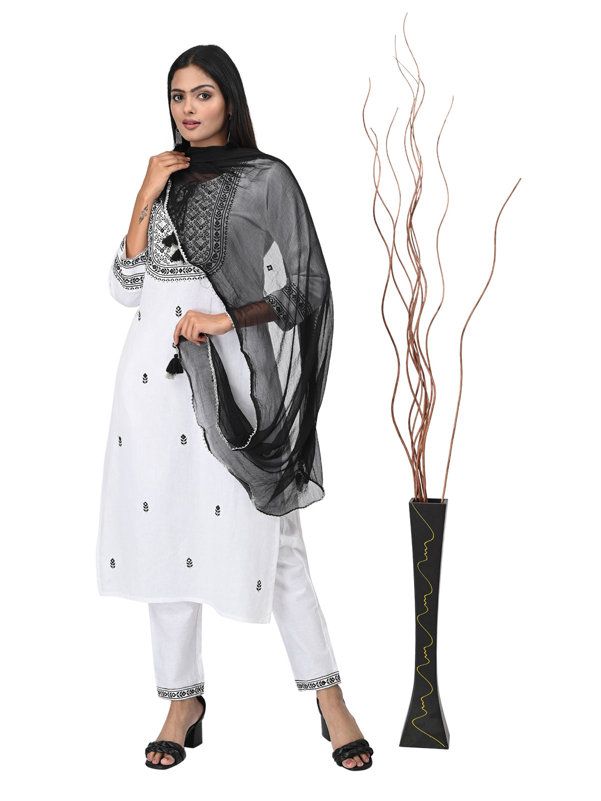 Step into timeless elegance with this beautiful white kurta set, designed for the modern woman who appreciates classic charm. Crafted from soft, breathable fabric, this straight-fit kurta features intricate black thread embroidery on the neckline, sleeves, and hemline, giving it a sophisticated ethnic touch. The delicate black motifs scattered across the kurta body add subtle detail without overpowering the minimalist look.
