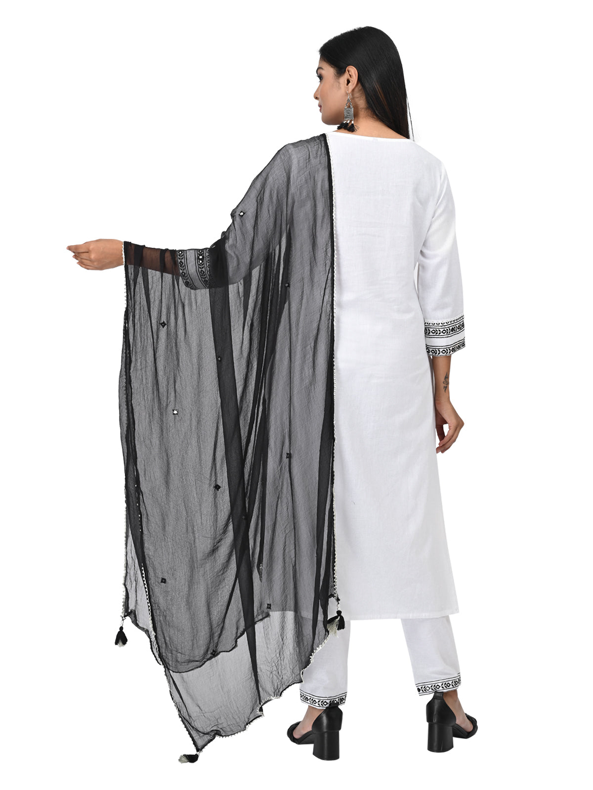 The set includes a matching white pant with coordinating embroidery on the cuffs, and a sheer black dupatta adorned with dainty sequins and a lightly fringed border, adding just the right amount of contrast and flair.