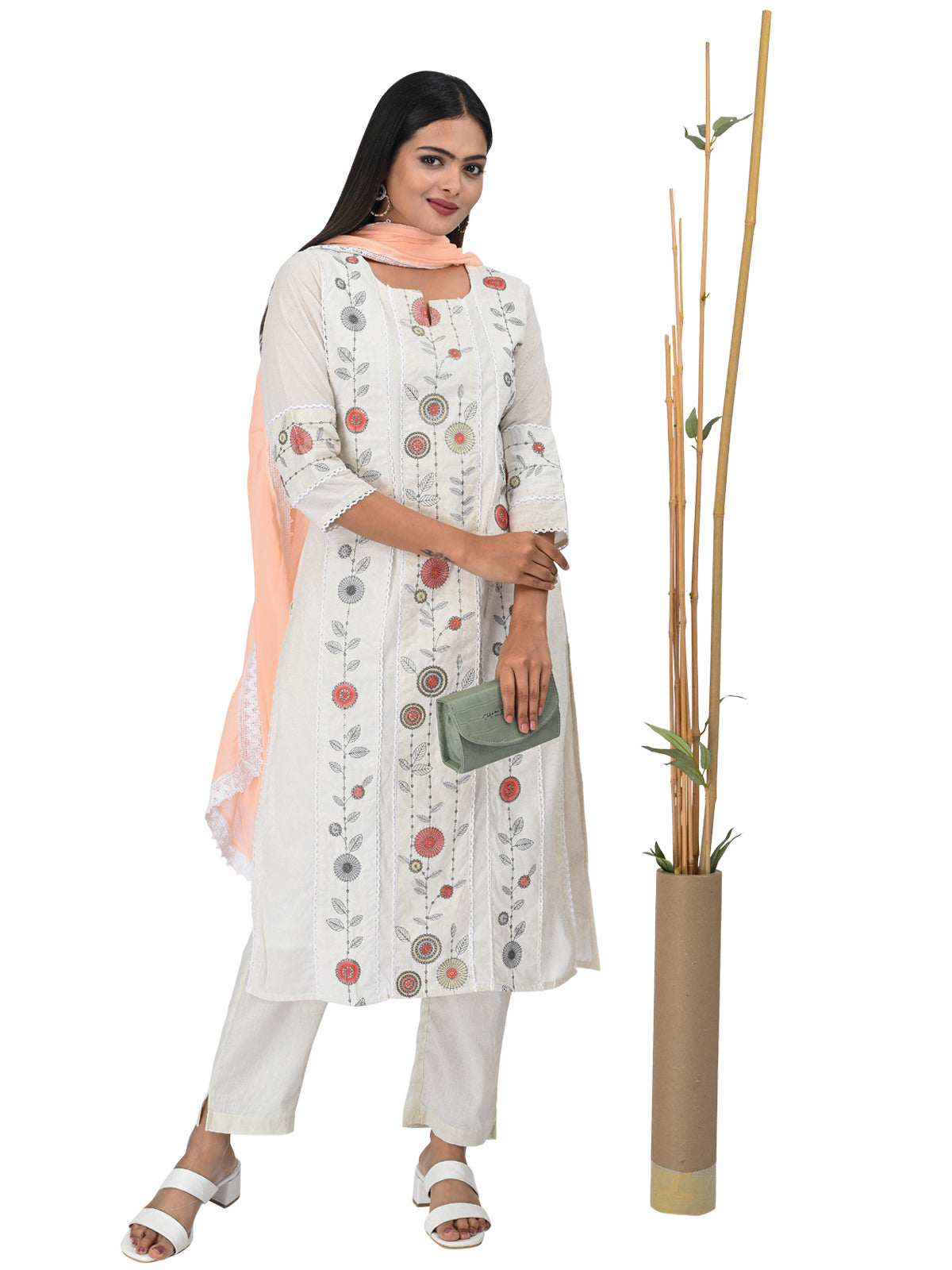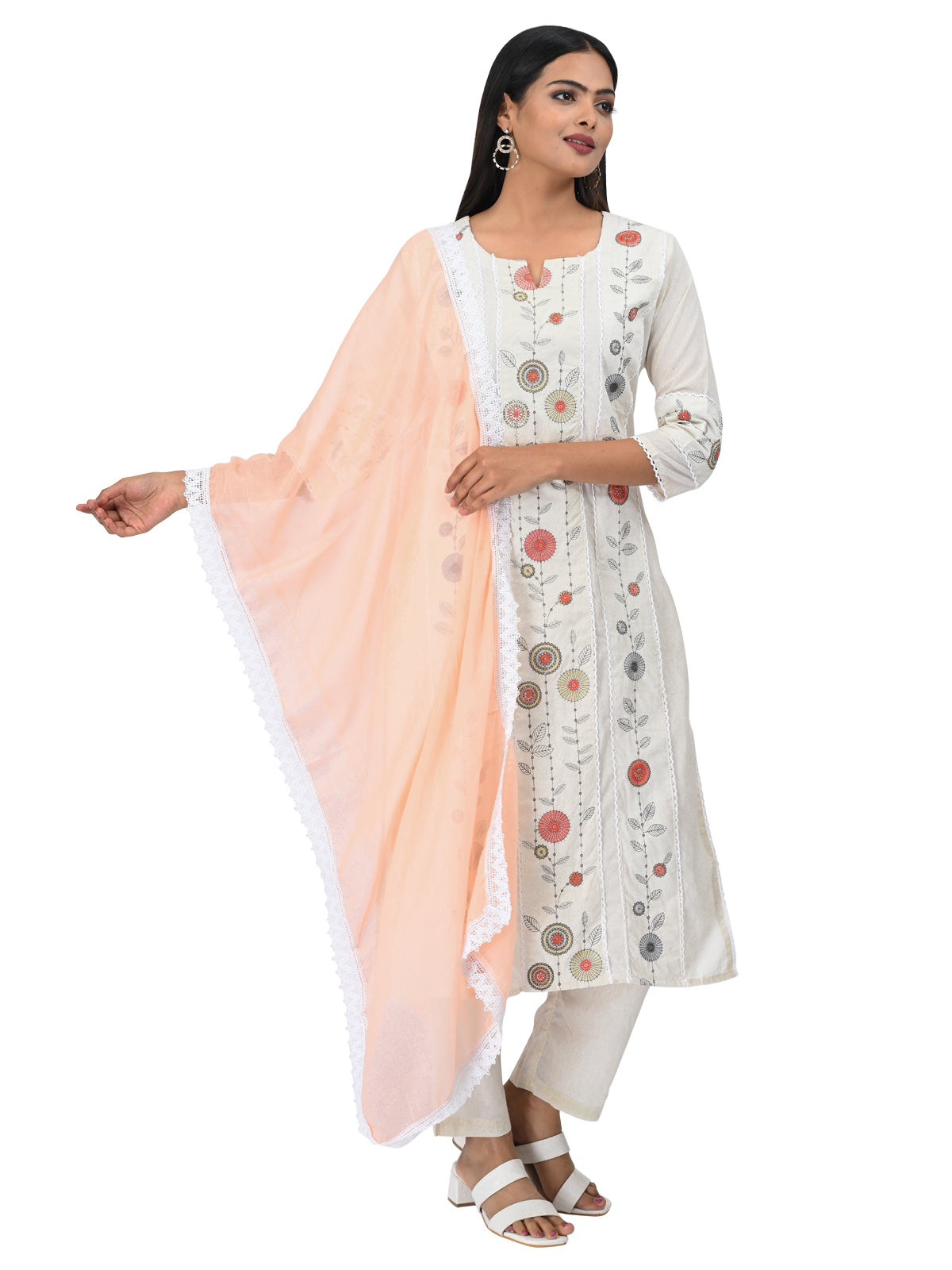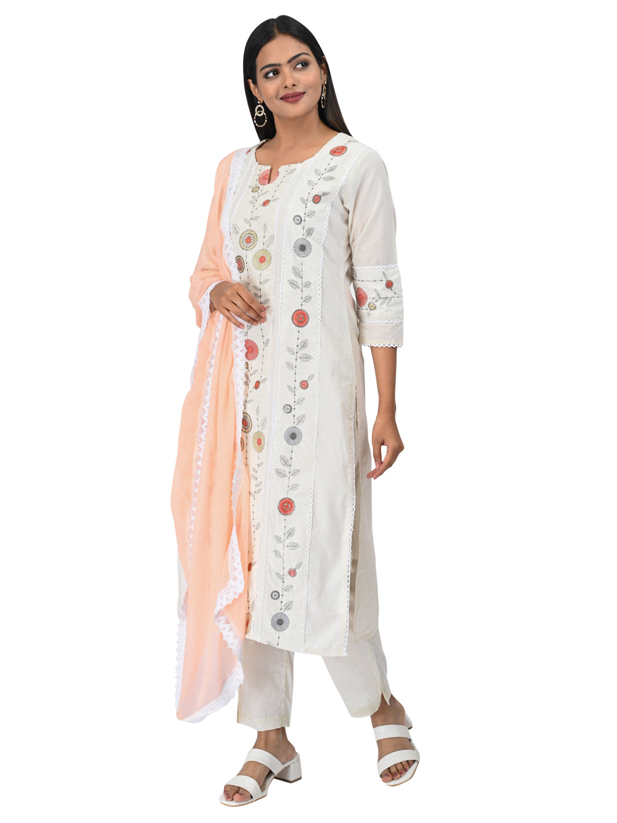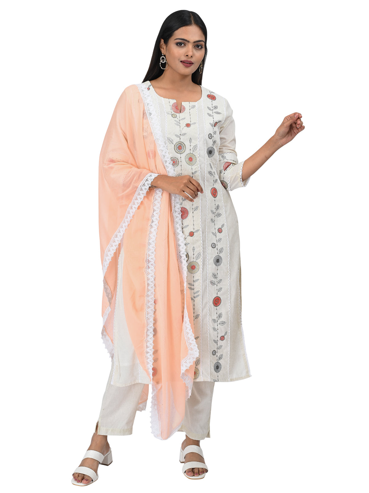 Subtle, sophisticated, and effortlessly stylish — this off-white embroidered kurta set is a timeless addition to your ethnic wardrobe. Featuring delicate floral embroidery in pastel tones and paired with a soft peach dupatta trimmed with lace, this ensemble exudes graceful charm. Perfect for daytime occasions, festive poojas, or elegant office wear.