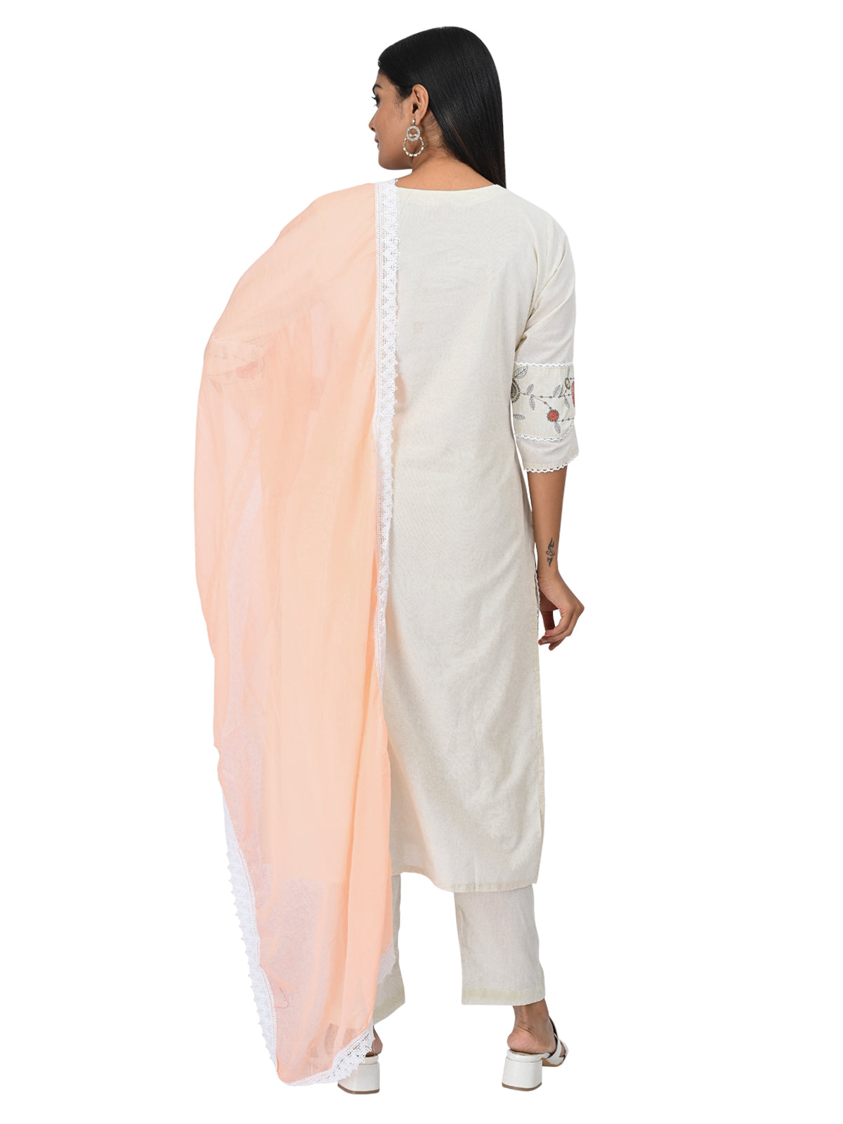 Off-White Embroidered Kurta Set with Peach Dupatta