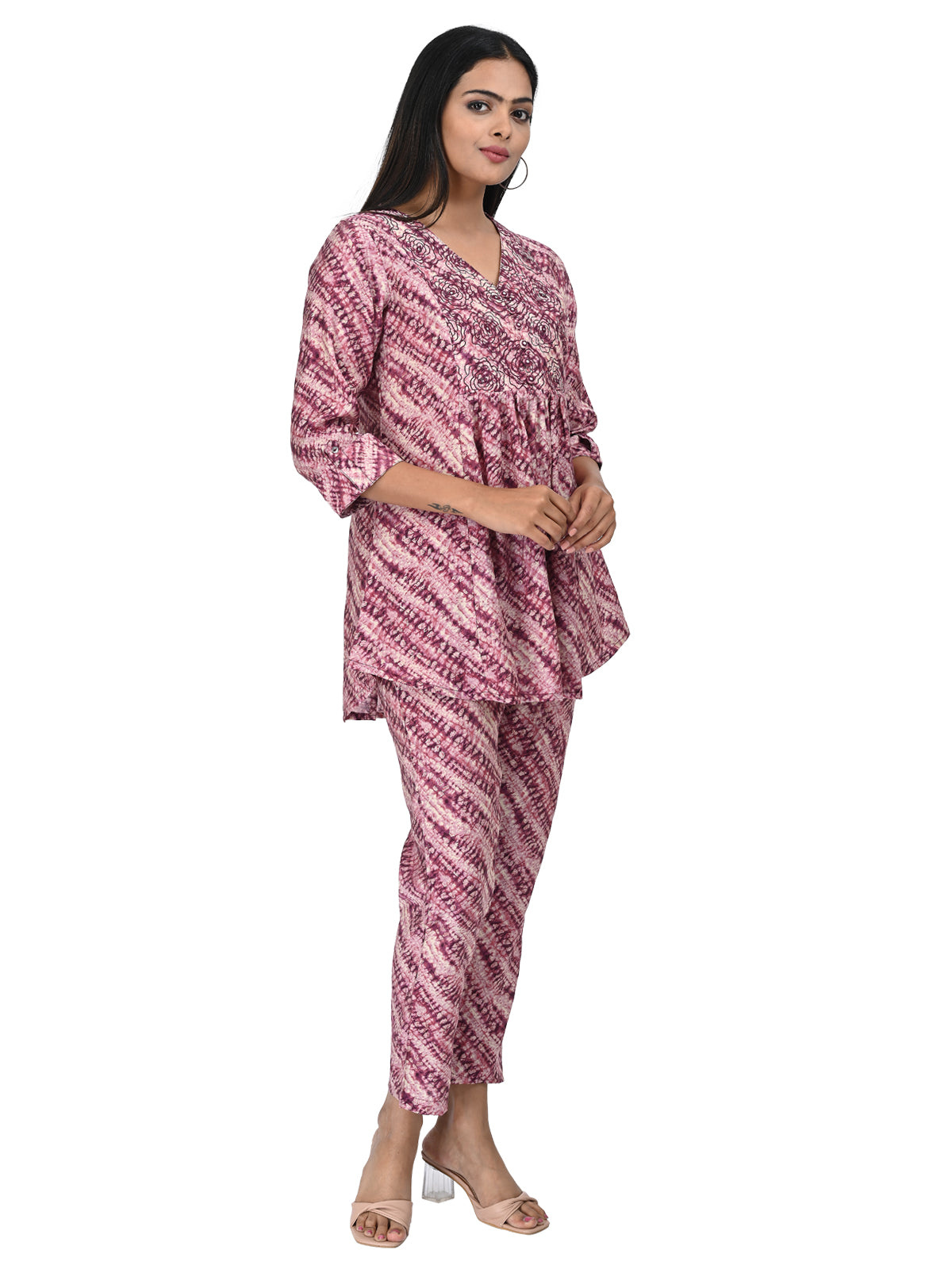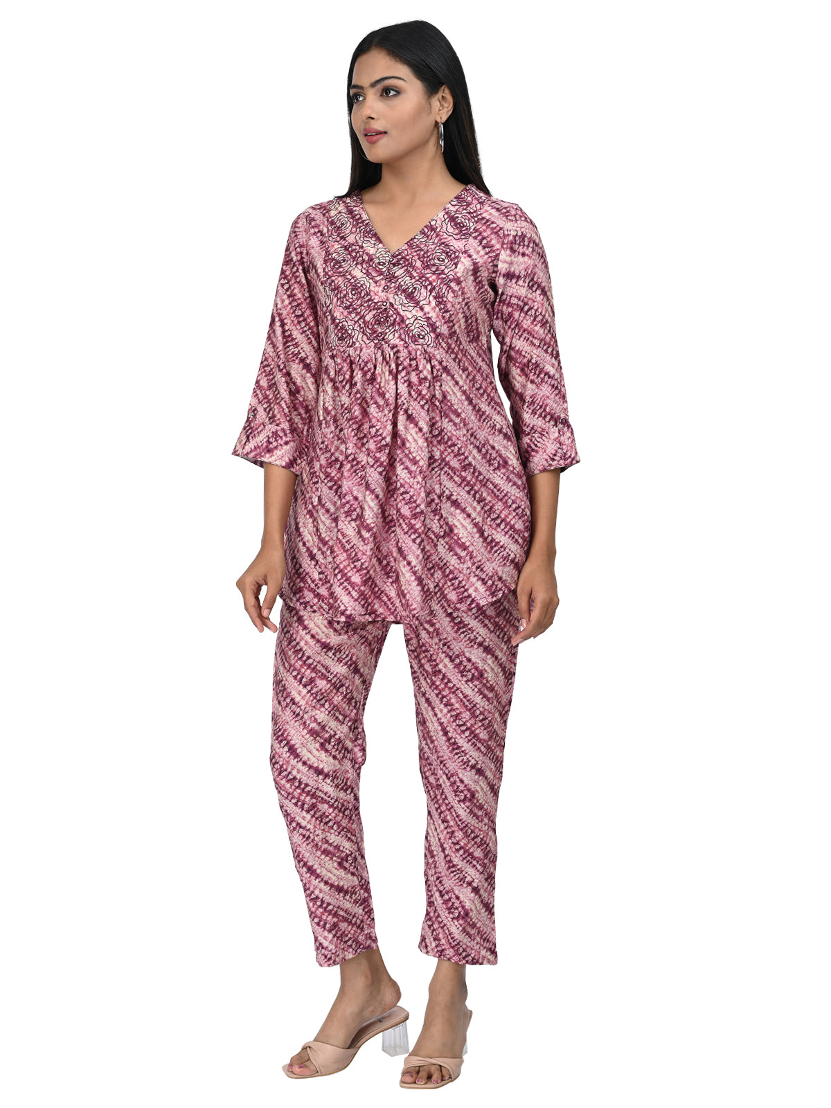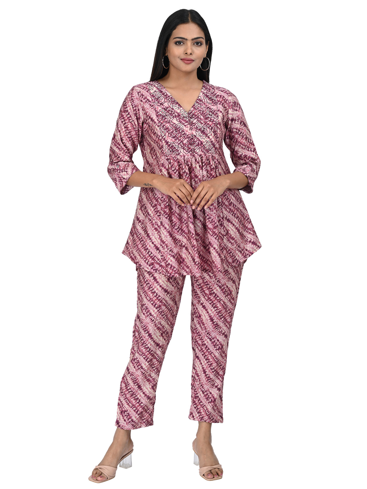 Add a touch of modern charm to your ethnic wardrobe with this stunning pink abstract printed co-ord set. The top features a flattering V-neckline with delicate rose motif detailing around the yoke and a stylish peplum silhouette that flares beautifully at the waist. The 3/4th sleeves and diagonal abstract pattern throughout lend a trendy and playful look. Paired with matching straight-fit pants, this set is made from soft, breathable fabric, offering both comfort and statement style. Ideal for casual gatherings, brunches, or office wear with a twist — this outfit is all about bold prints and flattering cuts.