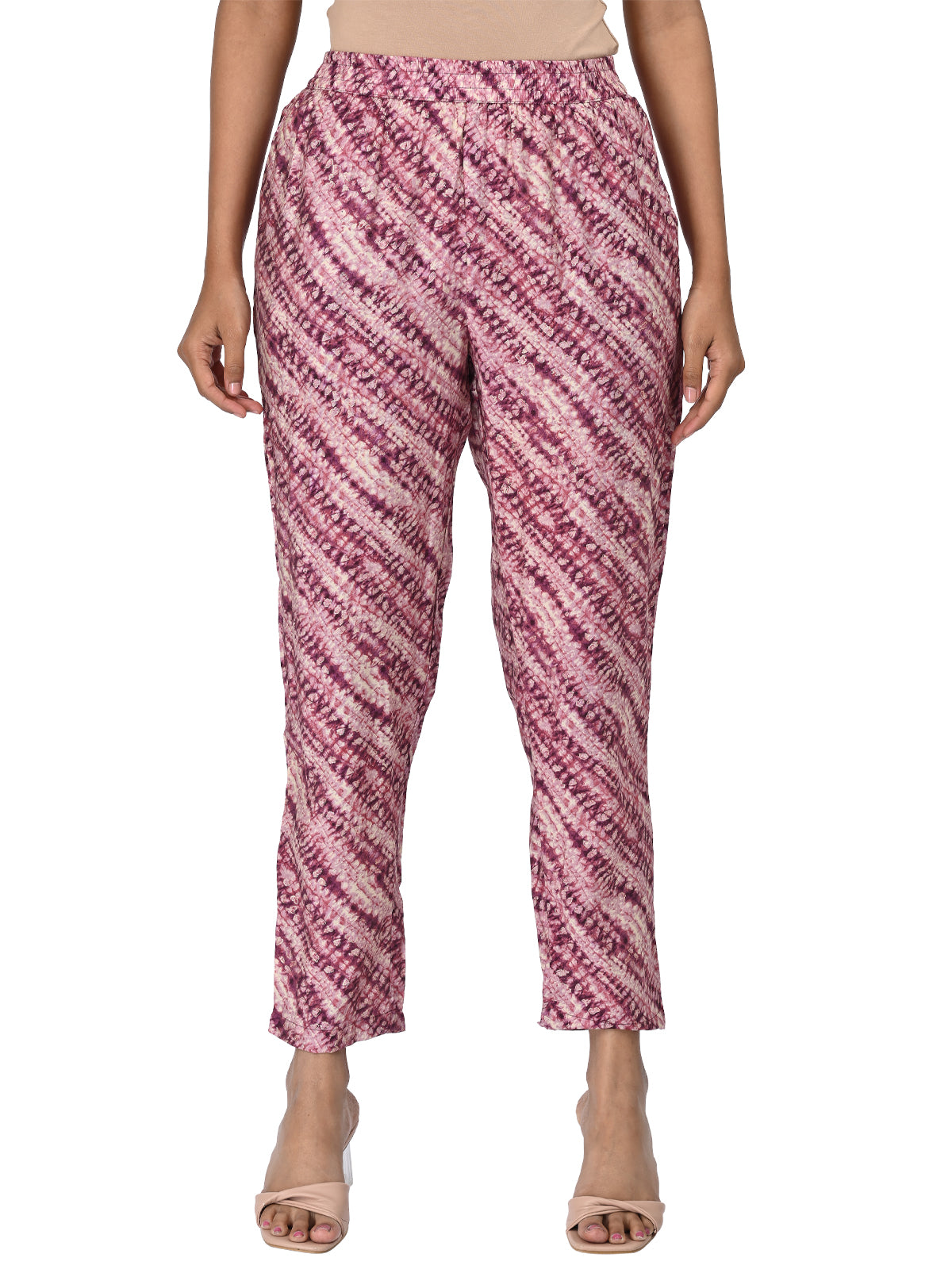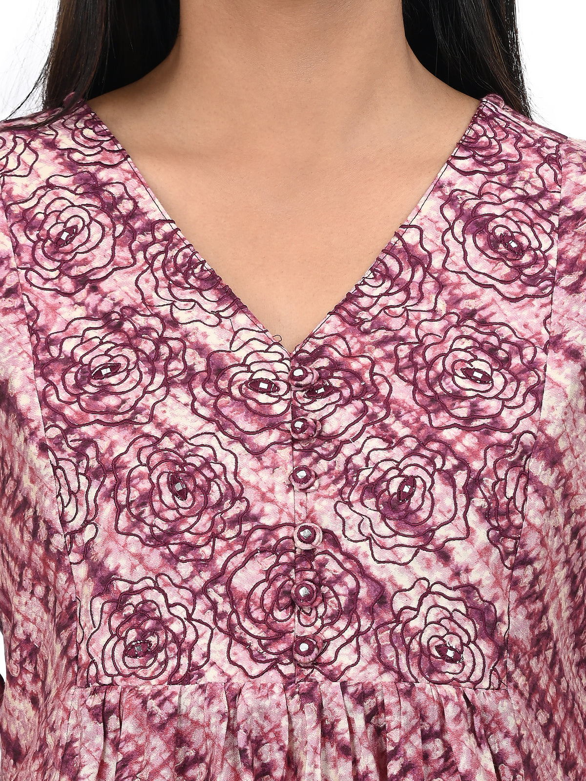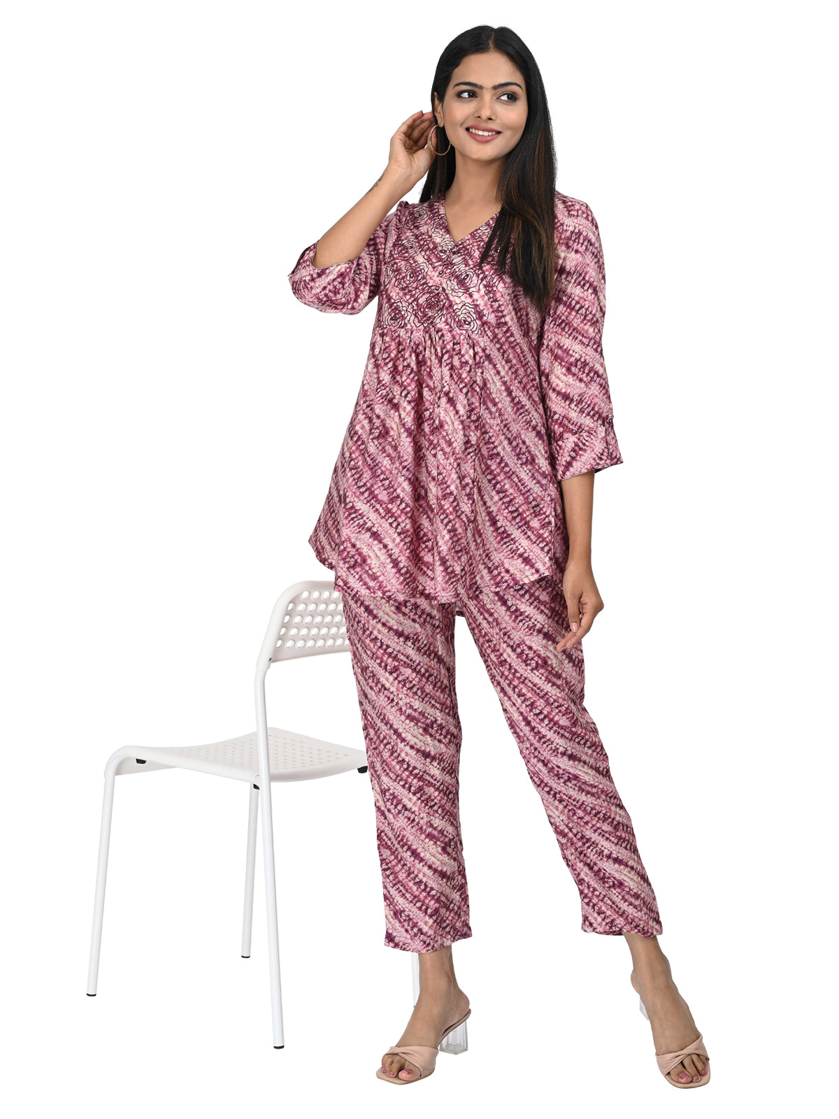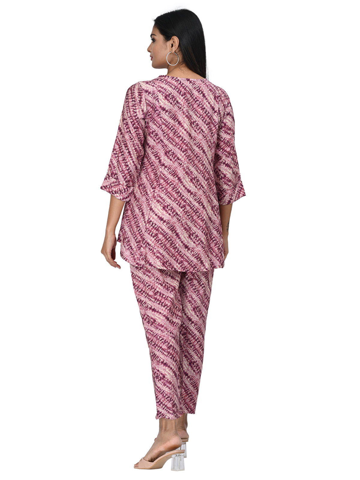 Add a touch of modern charm to your ethnic wardrobe with this stunning pink abstract printed co-ord set. The top features a flattering V-neckline with delicate rose motif detailing around the yoke and a stylish peplum silhouette that flares beautifully at the waist. The 3/4th sleeves and diagonal abstract pattern throughout lend a trendy and playful look. Paired with matching straight-fit pants, this set is made from soft, breathable fabric, offering both comfort and statement style. Ideal for casual gatherings, brunches, or office wear with a twist — this outfit is all about bold prints and flattering cuts.