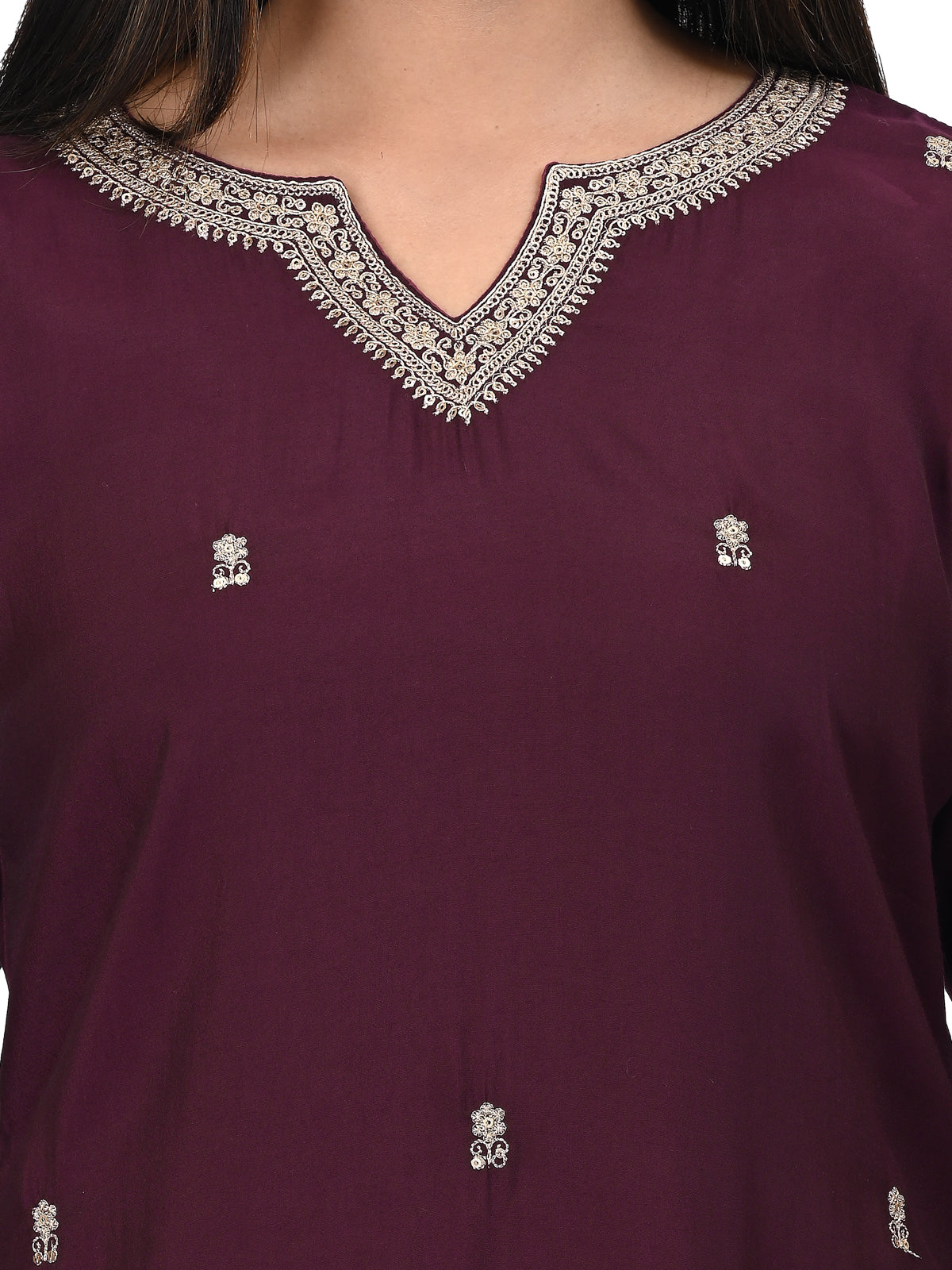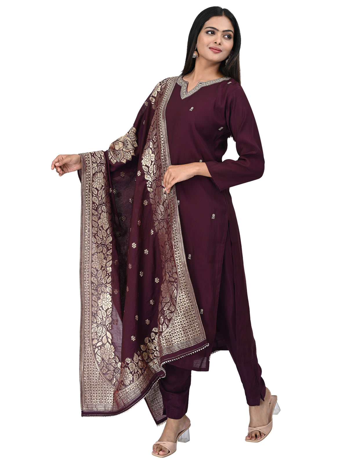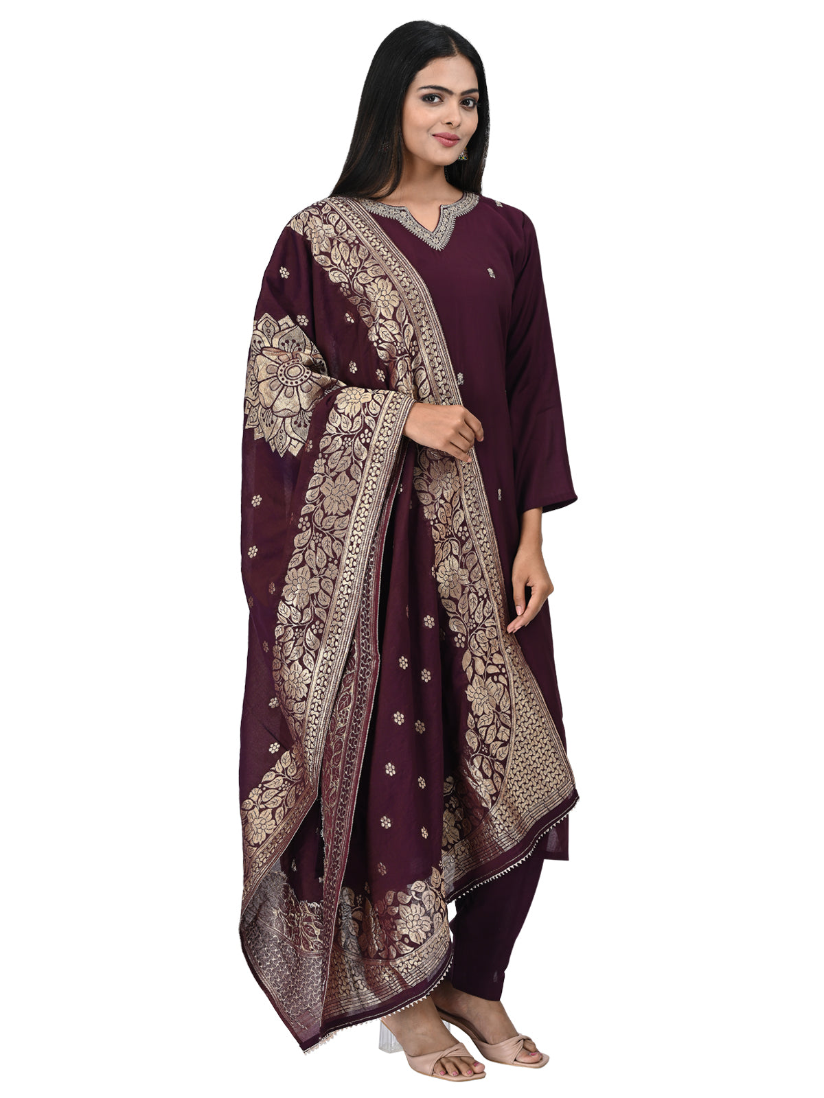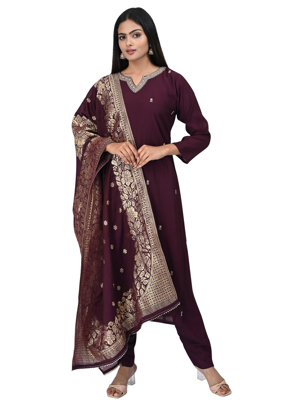 Step into timeless elegance with this deep wine embroidered kurta set, designed to elevate your festive and occasion wear. The kurta features delicate golden thread embroidery on the front and neckline, paired with a matching pair of pants for a clean, graceful silhouette. The star of the ensemble is the opulent wine-colored dupatta adorned with heavy gold zari borders and floral motifs, adding royal charm to your look.