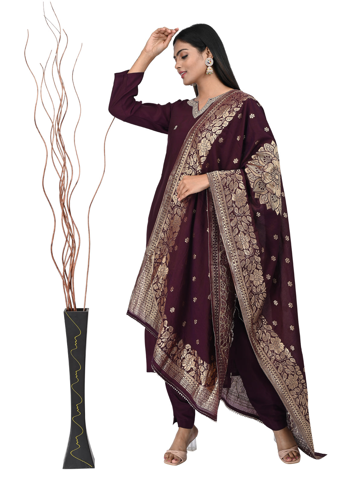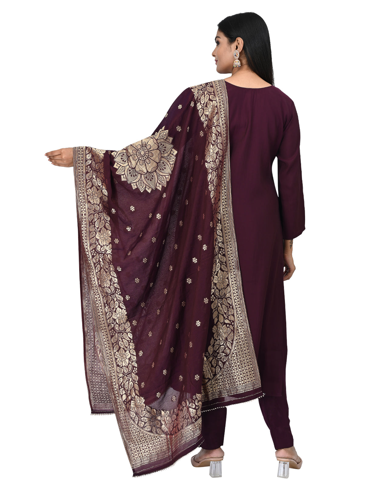 Dupatta: Wine base with intricate gold zari work